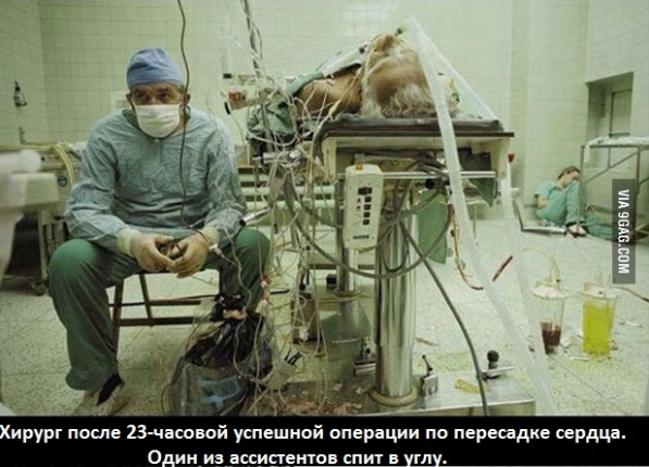 A surgeon after 23-hour successful operation for heart transplantation. One of the assistant is sleeping in the corner,
